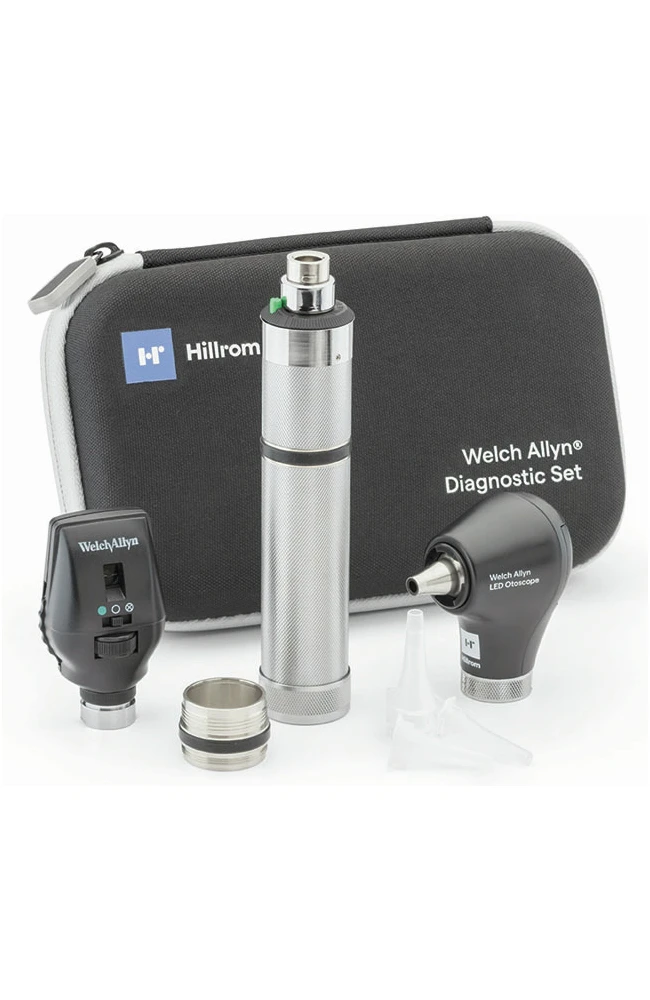 This Welch Allyn diagnostic set includes a Coaxial Ophthalmoscope, one basic diagnostic otoscope, a Nickel Cadmium Rechargeable Power Handle and a hard carrying case.