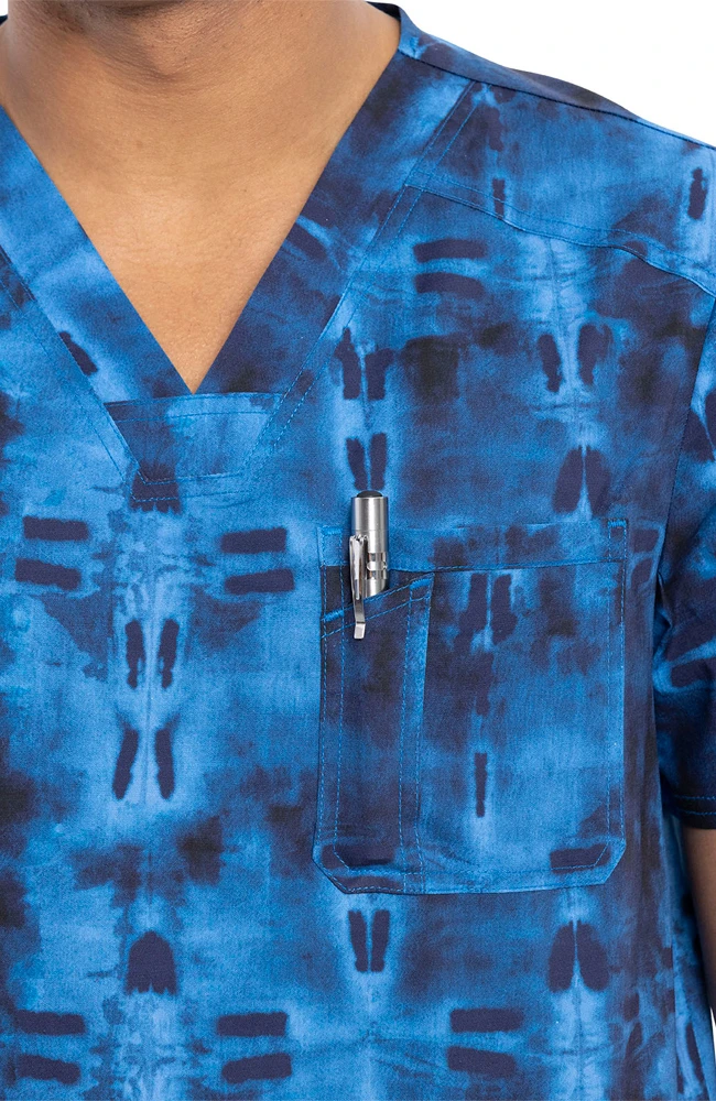 Enjoy the Fashion Prints by Cherokee Men’s Geo Tie Dye Print Scrub Top’s chilled out, summertime feel. This tie dye navy print is the perfect laid back look.