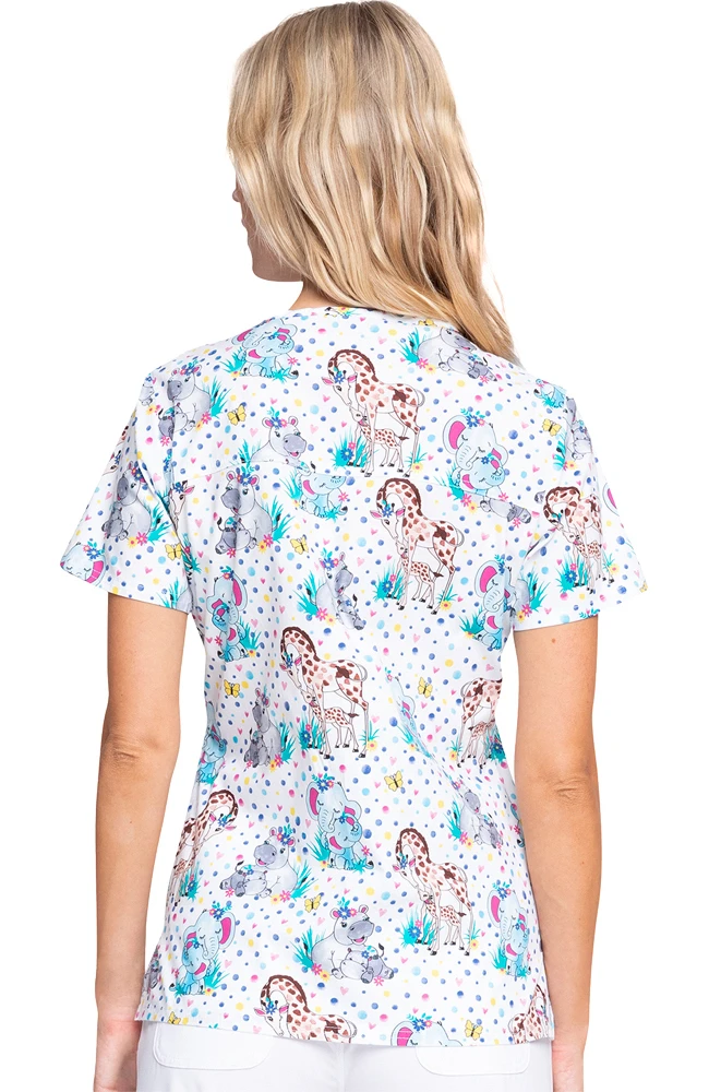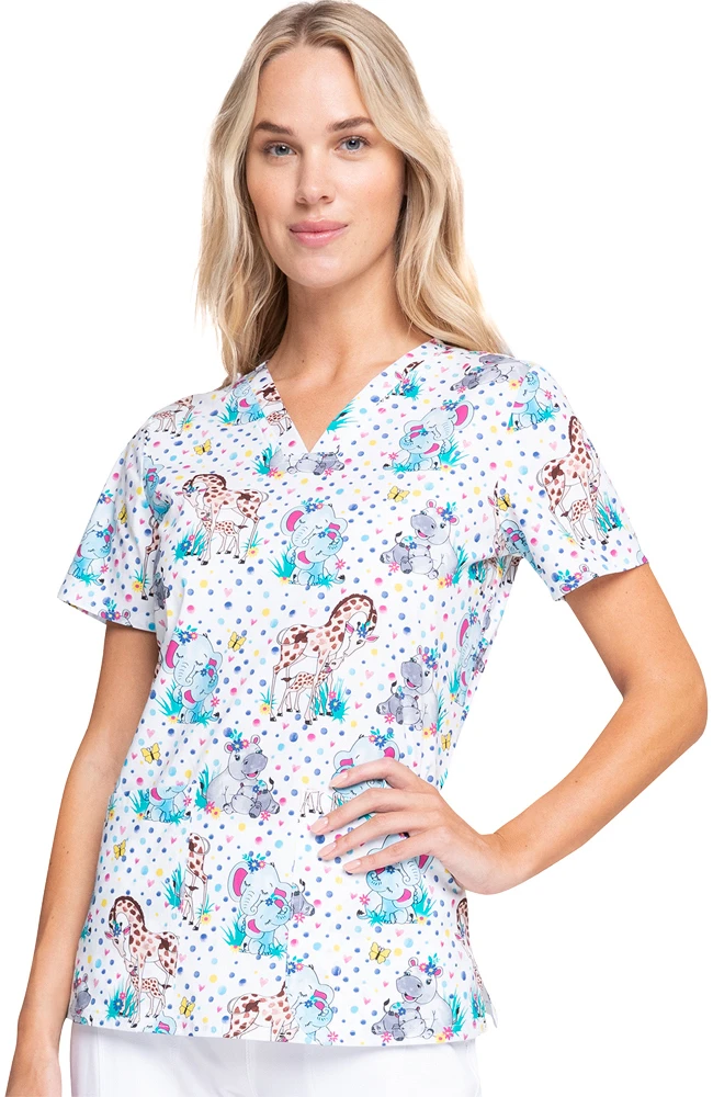 You’re sure to see smiles when you wear the Fashion Prints by Cherokee Women’s Jungle Babes Print Scrub Top. This adorable stretch cotton scrub top is ideal for pediatric settings.