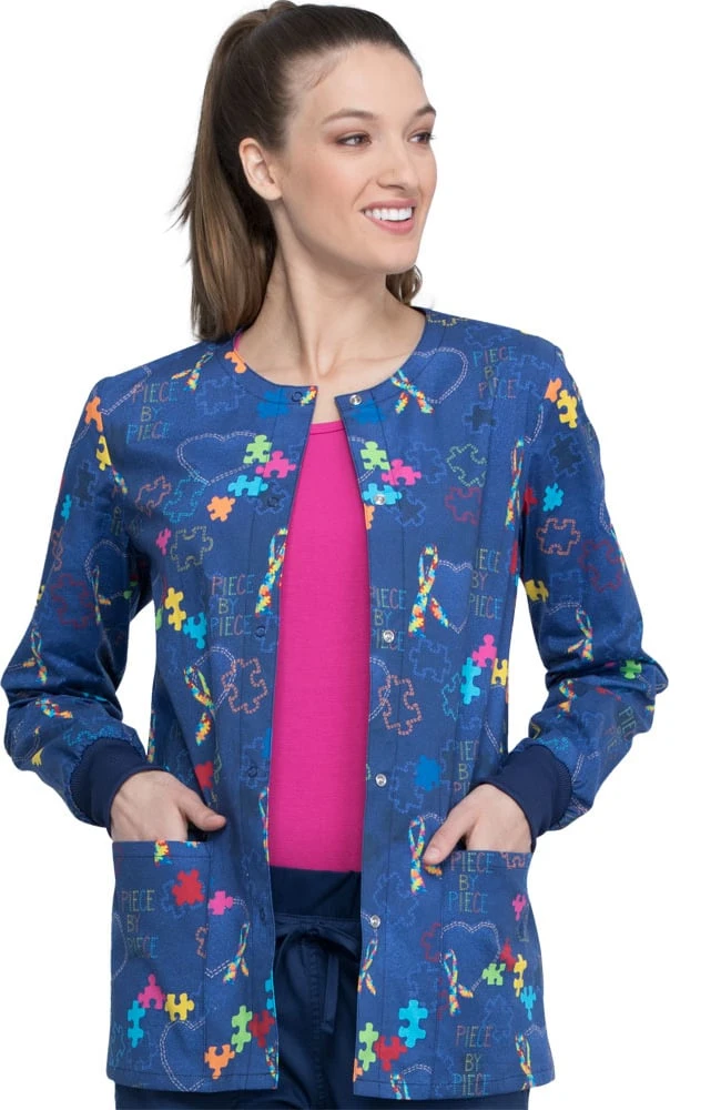 Speak your truth with the powerful Fashion Prints by Cherokee Women’s Piece Of My Heart Print Scrub Jacket. This warm and cozy scrub jacket features an Autism Awareness puzzle piece print along with inspiring quotes.