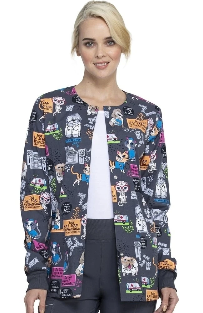 Select the purrfect accessory to keep warm on your rounds with the Fashion Prints by Cherokee Women’s Purramedics Print Scrub Jacket. This chic and unique animal-themed print is packed full of puns, pets and positivity.