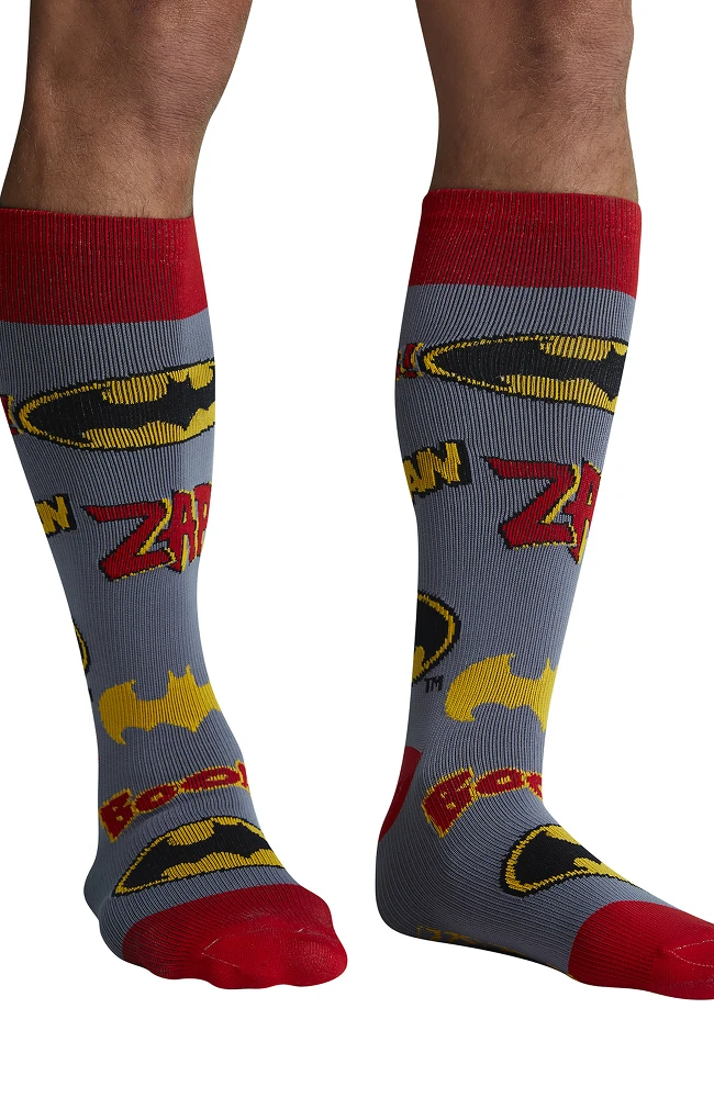 Feel like a superhero in the Tooniforms by Cherokee Men’s Support 8-12 mmHg Batman™ Mania Compression Sock. This pair combines an action-filled Batman design with graduated compression to give you relief during long shifts.