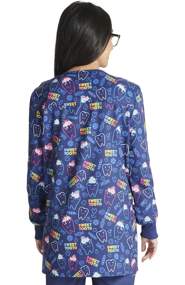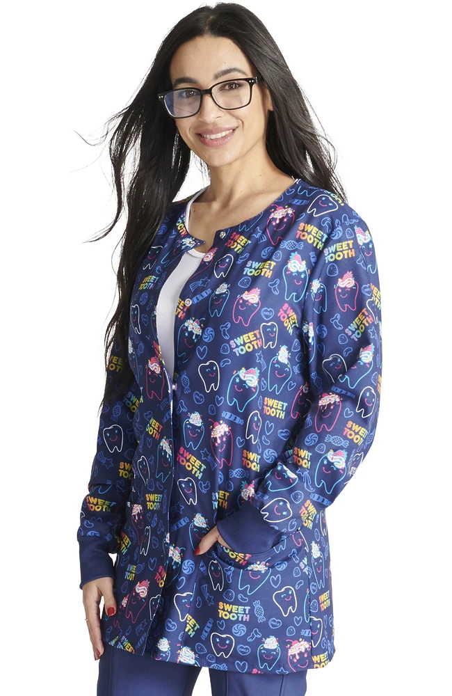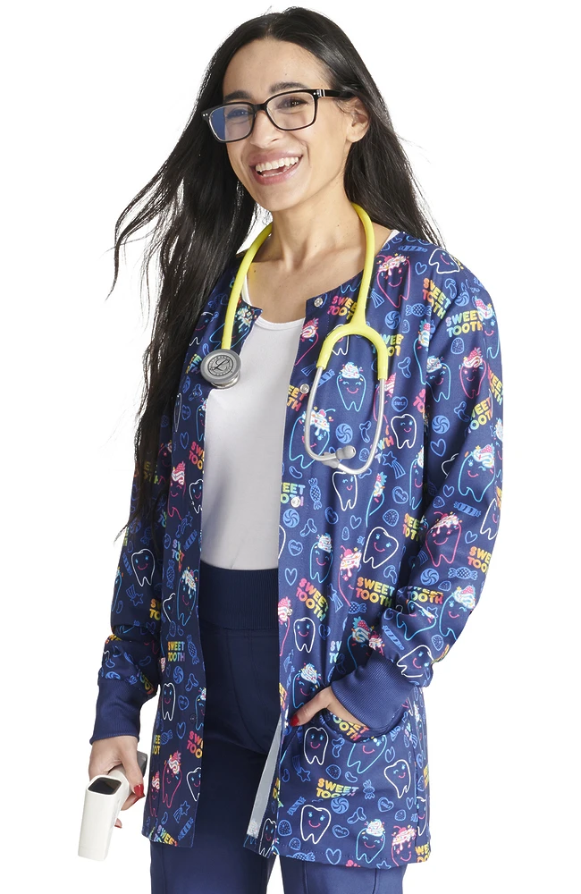 Ideal for dentistry settings, the Fashion Prints by Cherokee Women’s Snap Front Sweet Tooth Print Jacket is bound to make your patients smile. This playful warm-up jacket features stretchy fabric and rib-knit cuffs for extra comfort.