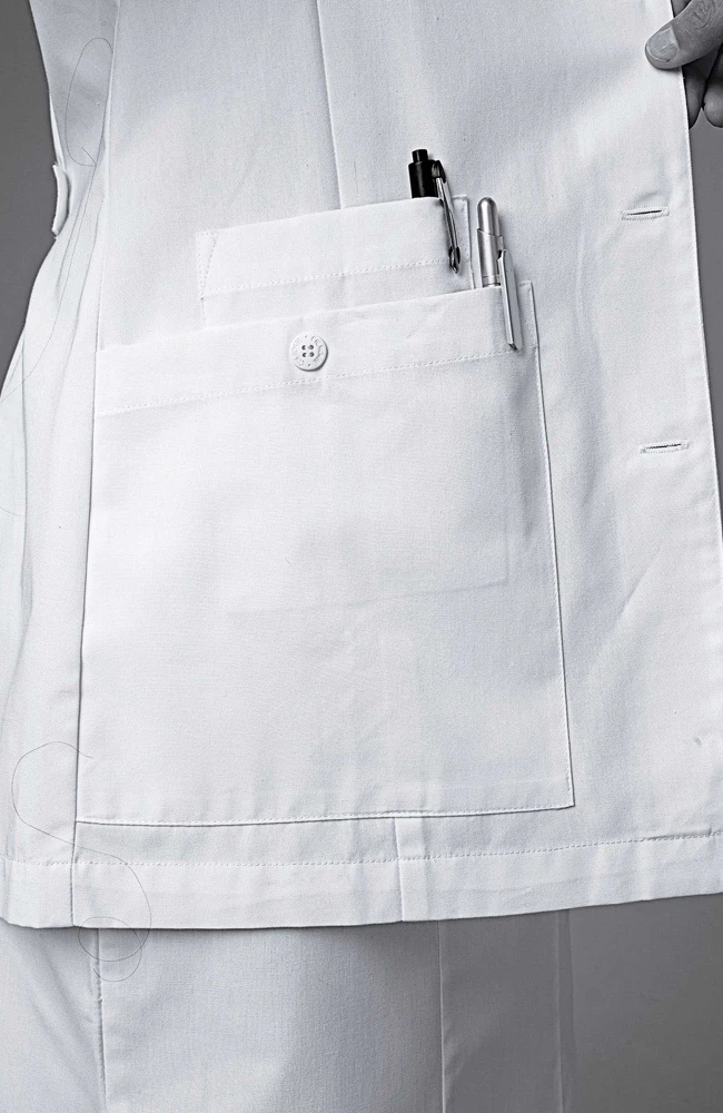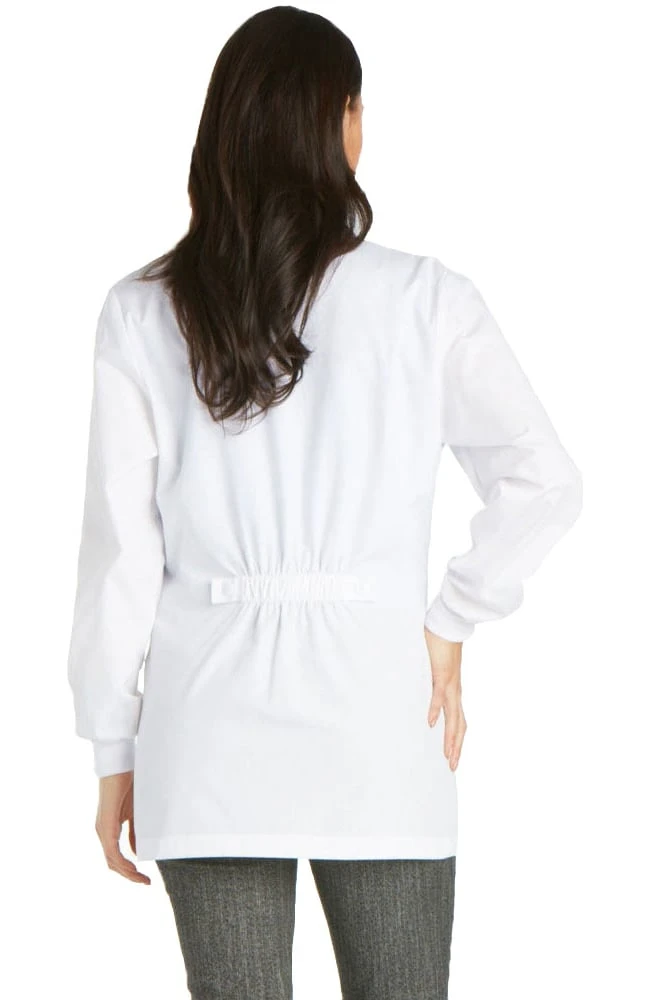 Professional Whites by Cherokee are comfortable, durable and designed to last. This notched lapel lab coat doubles as a warm-up jacket. Seams shape the front and an elastic inset with buttoned tabs shape the back. Rib knit cuffs. Patch pockets, extra utility pocket.