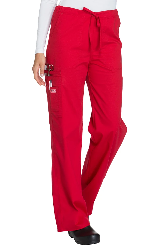 These unisex cargo scrub pants from Cherokee Workwear sport an adjustable drawstring waist and back leg seams. It has five pockets: two front patch pockets, a right side cargo pocket with extra cell phone/instrument pocket, and a back patch pocket. There is also an instrument loop above the right cargo pocket. The inseam is 31″. The fabric is a durable cotton/poly/spandex blend that has a touch of stretch for added comfort.