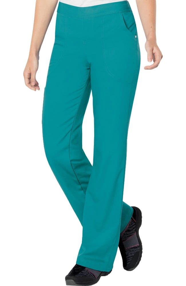 The Bailey is a flattering pull-on scrub pant featuring a flare leg and flat front. The 9300 from Urbane Ultimate has an drawstring and back elastic at the waistband. This pant has a natural rise and is relaxed through the hips, seat and thigh. There are front scoop pockets with rivets at the side seam and a cargo pocket on the right leg.