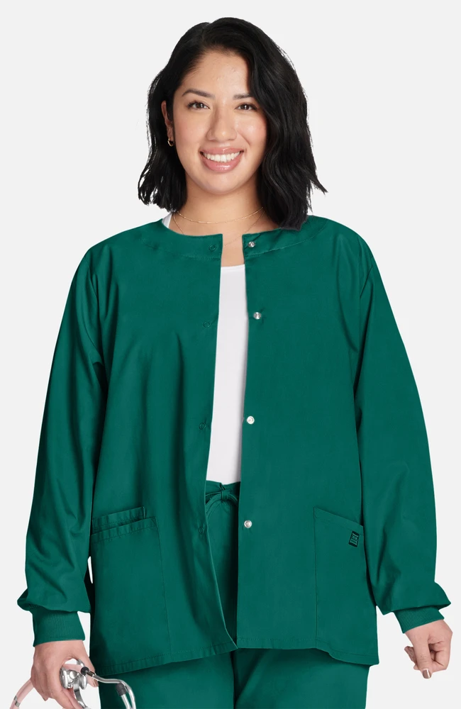 From Cherokee Workwear Originals, this jewel neck warm-up scrub jacket comes in many rich solid colors with four color-matched snap closures, making it a great uniform choice. It has rib knit cuffs, two patch pockets, and a peek-a-boo cell phone pocket. This jacket is made of soil-release poly/cotton poplin that is both comfortable and durable. The length is 30″.