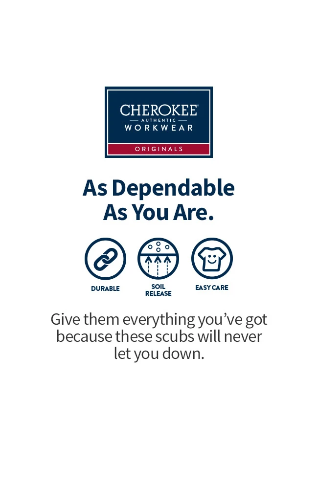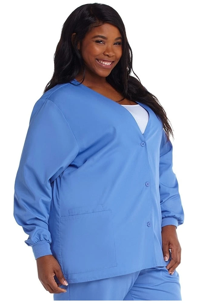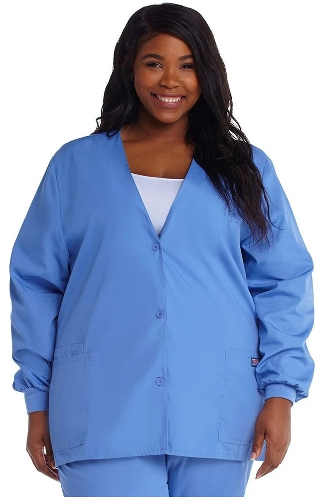 This cardigan style scrub jacket has a three-button front and matching knit cuffs. There are two patch pockets and one cell phone pocket. This scrub jacket is made by Cherokee Workwear Originals.