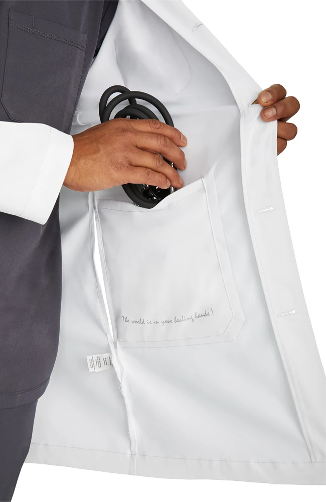 Show off your professionalism with the elegantly designed Lab Coats by Healing Hands Men’s Luke Lab Coat. This streamlined look includes side access slits, plenty of organizational pockets and a message from Healing Hand’s founder: The world is in you healing hands.