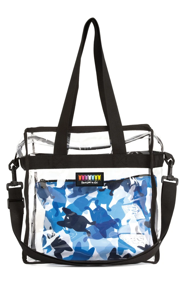 Carry your essentials in fun, modern style with the French Bull by koi Women’s Stadium Tote. This clear tote includes a cosmetic bag in the Camo Frenchie Navy print.
