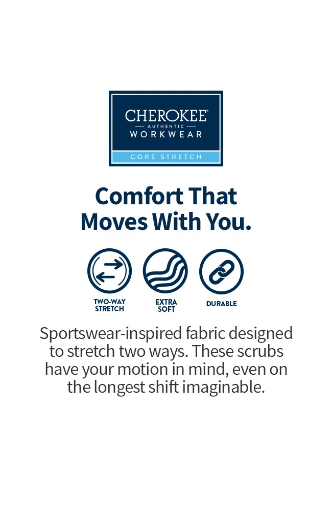 Cherokee Workwear Core Stretch scrubs have features that make them fashionable and ensure their durability. For example, these drawstring scrub pants have a back leg seam and double needle top stitching. In addition to the functional drawstring, these scrub pants have a comfortable knit waistband with encased elastic. There are lots of pockets, including two patch pockets. The cargo pocket on the right leg has several sections so you can comfortably carry all your tools. There are also two back patch pockets. The inseam is 31″. The fabric is a poly/spandex poplin.