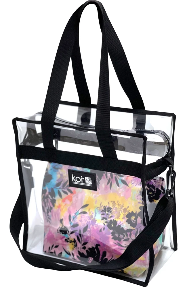Carry your essentials in fun, modern style with the koi Next Gen Women’s Transparent Hippie Garden Tote Bag. This clear tote includes a cosmetic bag in the Hippie Garden print.