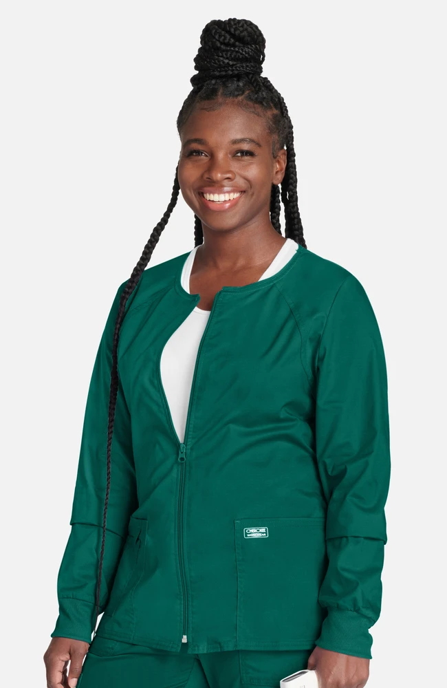 This jewel neck zip-front warm-up scrub jacket from Core Stretch by Cherokee Workwear has a touch of stretch. It features two patch pockets, the right side pocket is layered with a sectional pocket and I.D. loop. The flattering fit is shaped by a yoke and princess seams at the back, and raglan seams at the front. Matching knit cuffs make it cozy. The center back length is 27″.